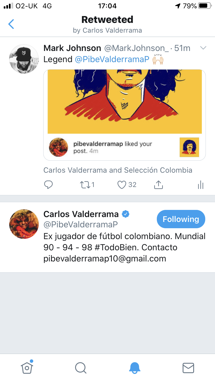 Like and retweet from the Colombian legend Carlos Valderrama.